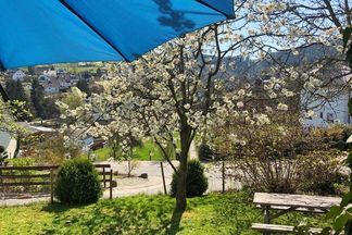 De woning staat op een ruim perceel met terras en tuinhuisje op het zuidwesten.De tuin is te bereiken via een aflopend pad naast het huis. Er is voldoende tuinmeubilair aanwezig zowel om te zitten als te liggen (moderne relaxbankjes). Vanaf het terras heeft u een prachtig uitzicht en kunt u echt genieten van de heuvels, weilanden en bossen waarop u uitzicht heeft. De kinderen kunnen prima spelen in de tuin waarin ook fruitbomen staan.